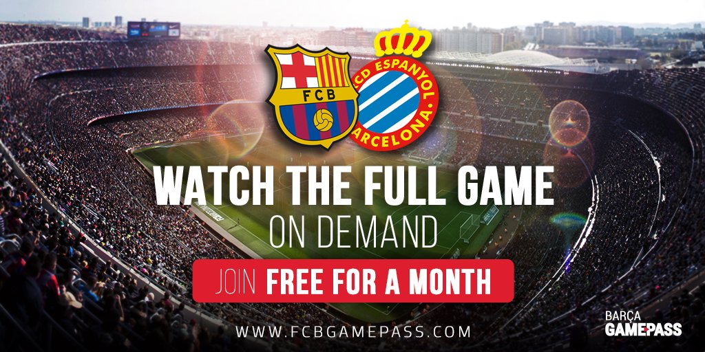 Subscribe now to Barça GamePass & watch #FCBEspanyol on demand FOR FREE! http://ow.ly/4nux5b pic.twitter.com/aylG4iqrlV"