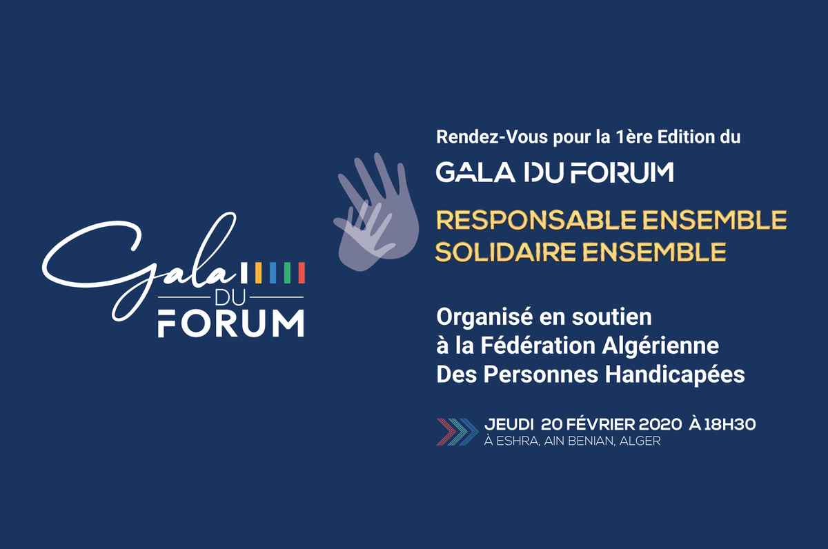 حضوركم يوم 20 فيفري 2020 في الحفل التضامني للمنتدى بالمدرسة العليا للفندقة والاطعام بعين البنيان، الجزائر العاصمة، هو دعم للفدرالية الجزائرية للأشخاص ذوي الاعاقة سجلوا على الرابط التالي: http://www.fce.dz/inscription/