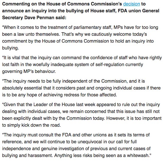 Positive step that MPs’ bullying behaviour will be under the spotlight - but if the inquiry is to command real confidence with staff it must be fully independent, and cannot ignore individual cases. Full FDA statement is here:pic.twitter.com/eksn1uNNT8