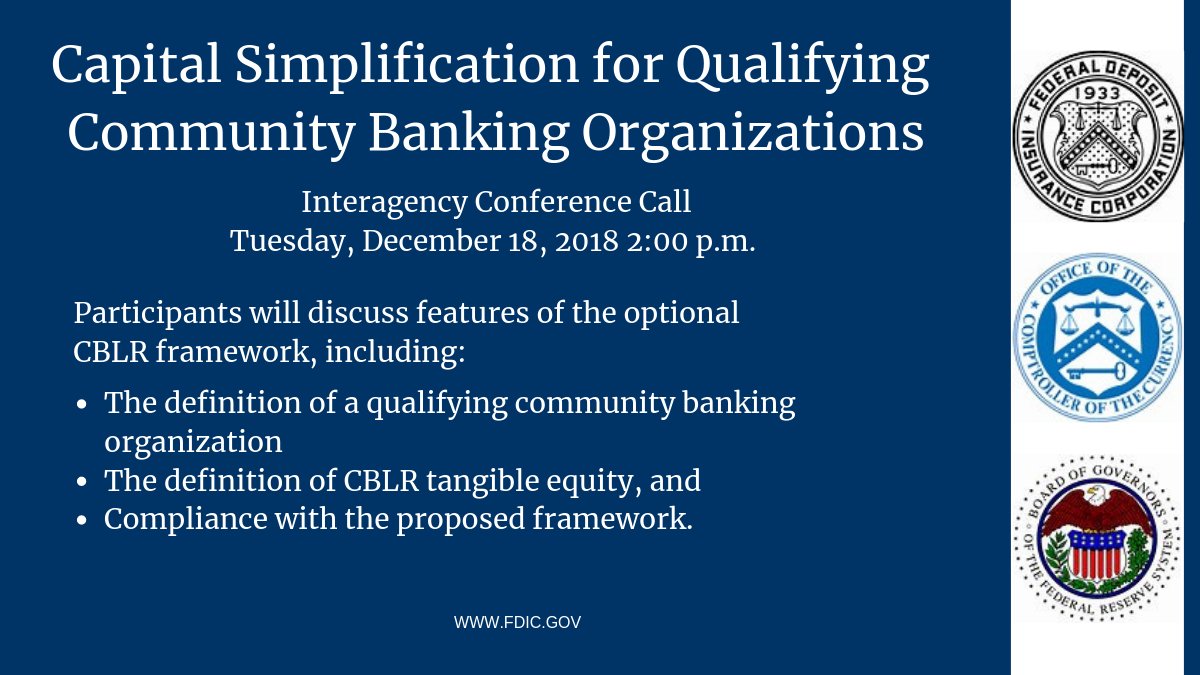 @FederalReserve, and@USOCC are hosting an interagency conference call to discuss the optional community bank leverage ratio (CBLR) framework. Tuesday, December 18, at 2:00 p.m. ET Learn more: https://go.usa.gov/xEqZC#communitybankspic.twitter.com/J4rrfAbEeY