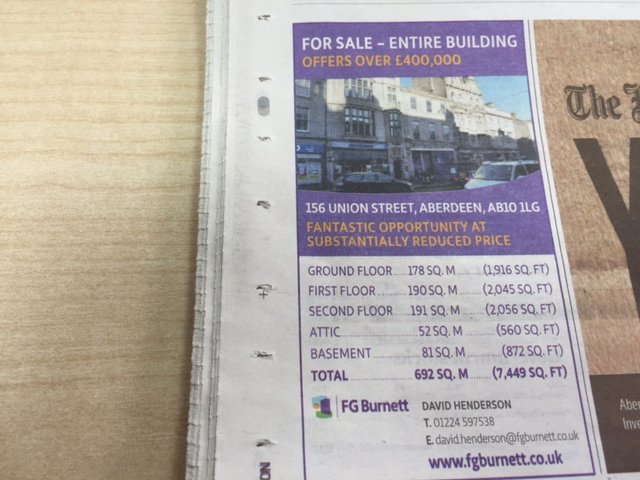 See today's P&J for details of retail property FOR SALE on Union Street at the substantially reduced price of offers over £400k - an entire building spanning 3 floors! Contact David Henderson on 01224 597538 for further details.