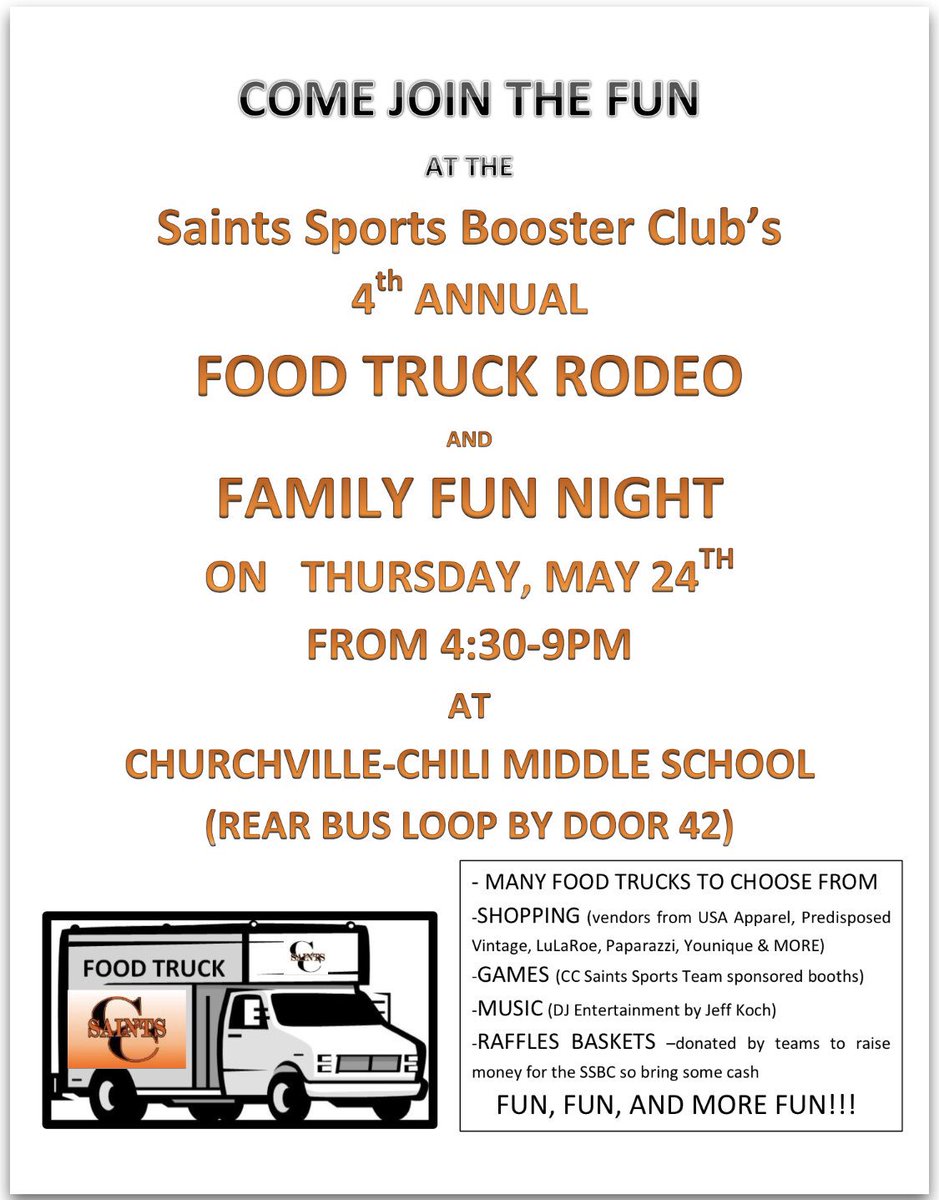 Have you missed us? If so, please come to the Churchville-Chili Saints Sports Booster Club's Food Truck Rodeo tomorrow from 4:30-9:00 p.m. at bus loop behind the middle school. End your Thursday the best way possible with dinner, shopping, games, music, raffles, and ROBOTS!pic.twitter.com/yIYdaefWoi