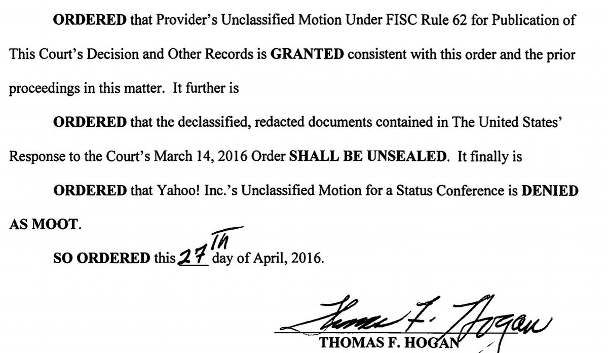 The Court finally declassified the FISC and FISCR's opinion compelling Yahoo!'s assistance: http://www.fisc.uscourts.gov/sites/default/files/105B%28g%29%2007-01.pdf …pic.twitter.com/QKowhkqgSL