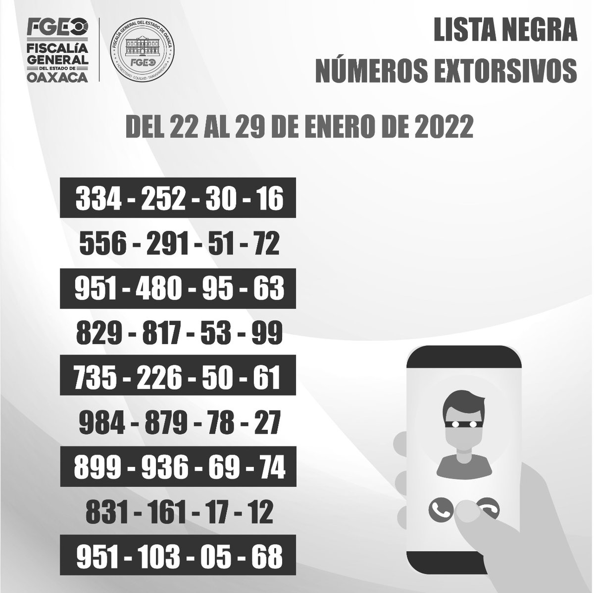 #Entérate | La@FISCALIA_GobOax te da a conocer los 20 números telefónicos de extorsión existentes en la base oficial registrados del 22 al 29 de enero de 2022.pic.twitter.com/Yl9hDDd5UO