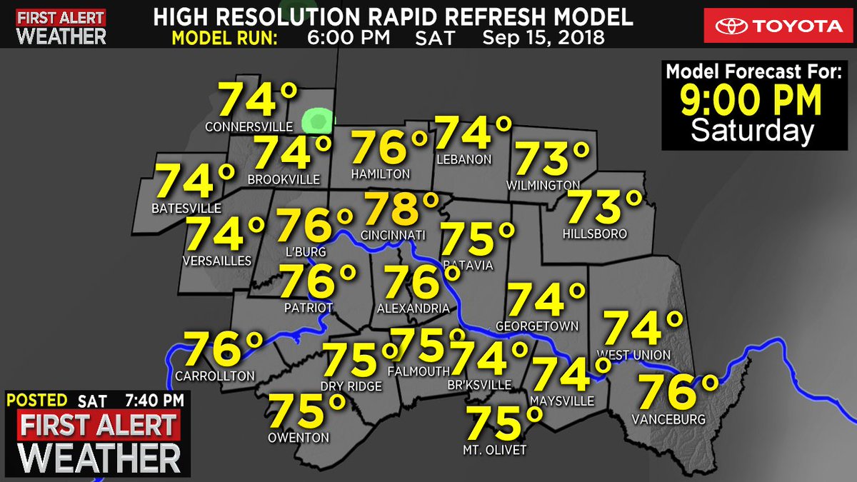 High Resolution Rapid Refresh (HRRR) model shows for the next 1+ hours. An animated version is on Steve Horstmeyer's FB page at https://www.facebook.com/fox19stevehorstmeyer/ … Check out the the First Alert Weather app here: http://onelink.to/cxmvwv pic.twitter.com/wOsSvgGHtr