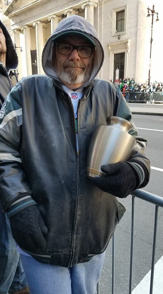 ETERNAL FAN: Dennis was spotted at the Super Bowl parade holding an urn with the ashes of his late wife, Becky. He says she was a die-hard @Eagles fan, and he wanted to make sure she didn’t miss the parade. 😭😭 MORE: http://bit.ly/2C8pH8G  📷: Dustin Javierpic.twitter.com/SAhfhg7MOi
