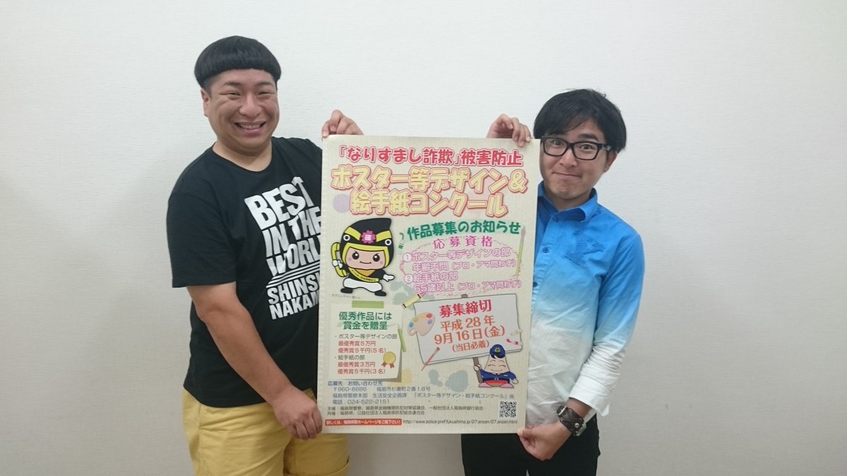 なりすまし詐欺の被害防止を呼びかけるイラストと絵手紙を募集しています。 応募詳細は、県警ホームページまで! http://www.police.pref.fukushima.jp/07.anzen/07.anzen.html … (写真の二人は、福島県住みます芸人「ぺんぎんナッツ」)pic.twitter.com/yqBGcILjci