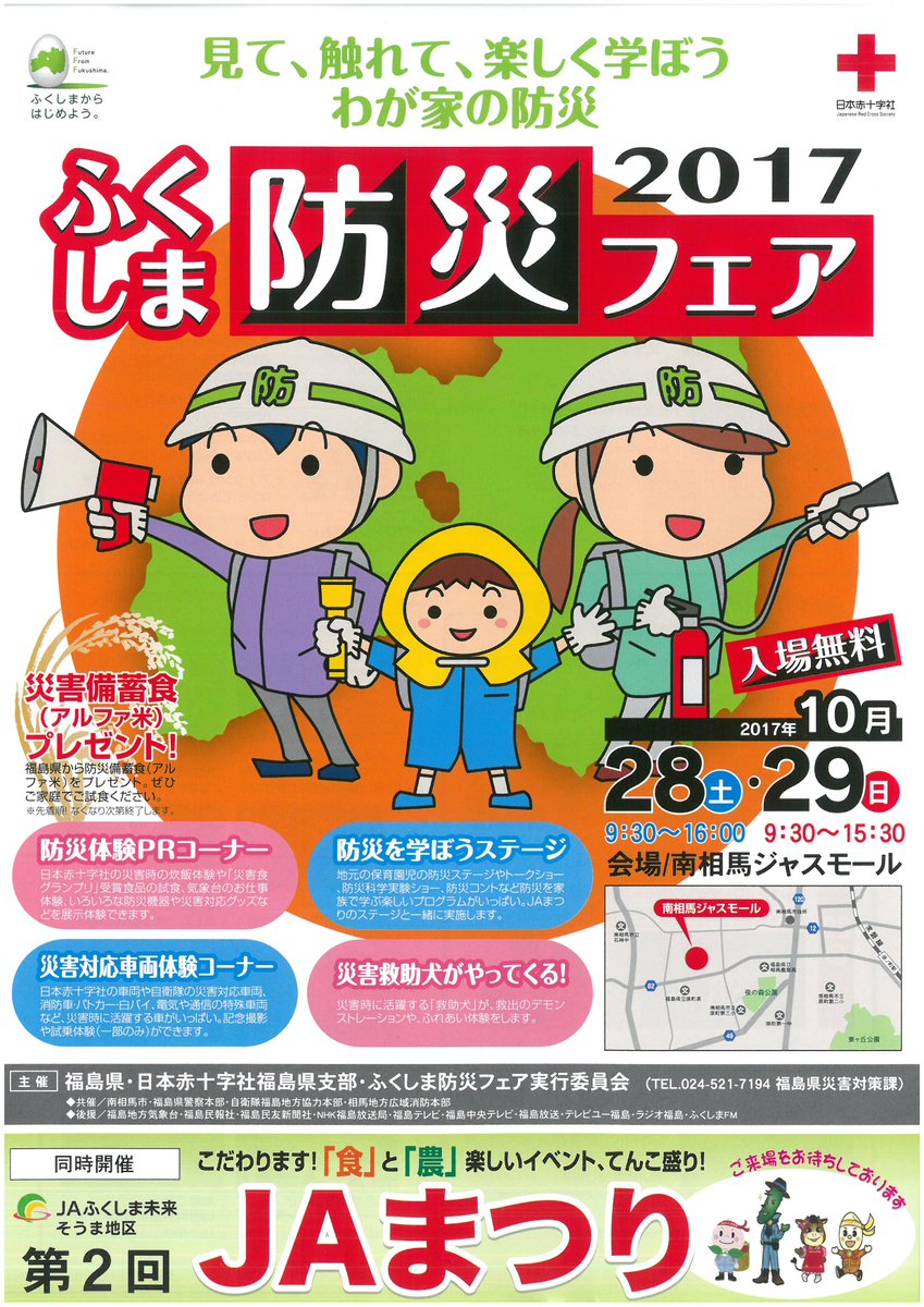 【災害対策課】『ふくしま防災フェア2017』 10月28日(土)9:30~16:00・29日(日)9:30~15:30 南相馬ジャスモール(南相馬市原町区大木戸金場77) 入場無料の楽しいイベントで警察車両の展示も行う予定だよ! #福島県警察 #防災フェア #イベントpic.twitter.com/K1VEsxrI8Z