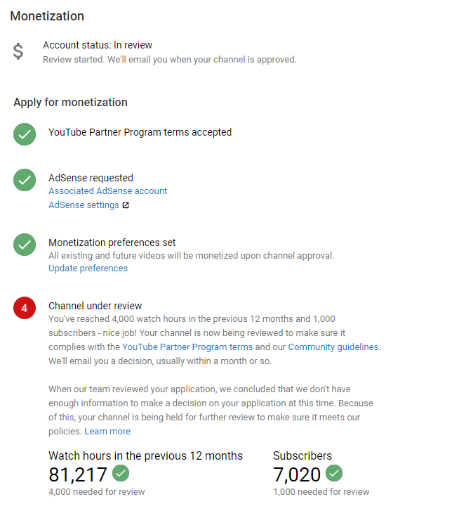 We'd like to look into it. Mind sharing a screenshot of your channel's monetization page: https://yt.be/help/v9Zf ? Keep us posted.