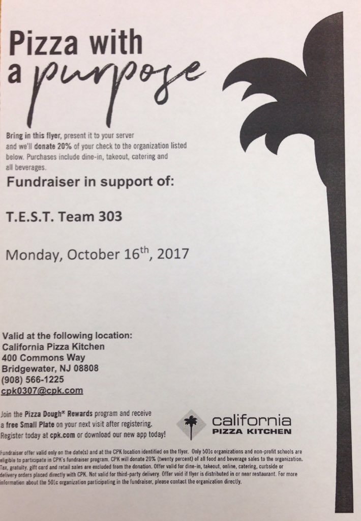 We are holding a fundraiser today. Show this flyer when ordering and part of your order will go to the team! #californiapizzakitchen
