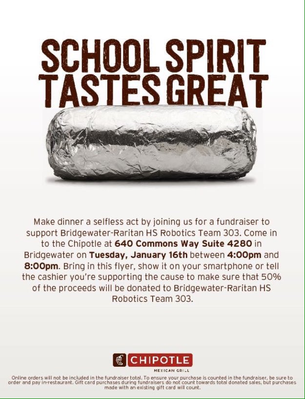 Today we will be teaming up with the Chipotle on Commons Way to bring half of your proceeds straight to the team. Just show this flyer, or tell them you would like to donate to Team 303 as you pay, only between 4-8 pm. #chipotle