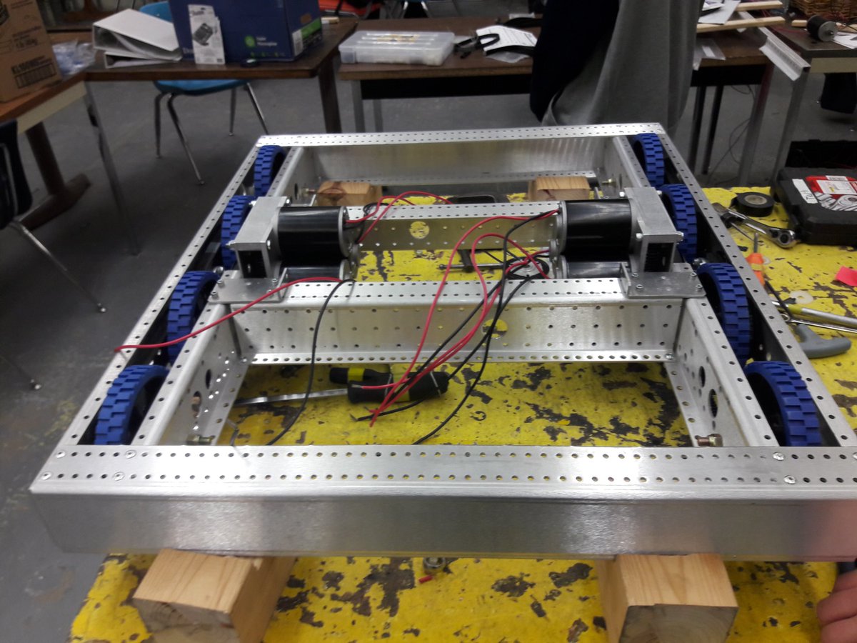 Drive train is all together! Now for electronics and our manipulator(s). #omgrobotspic.twitter.com/PdM5iFPV0c