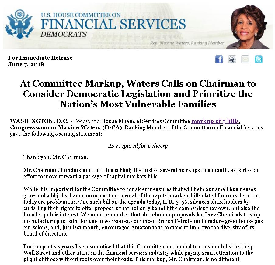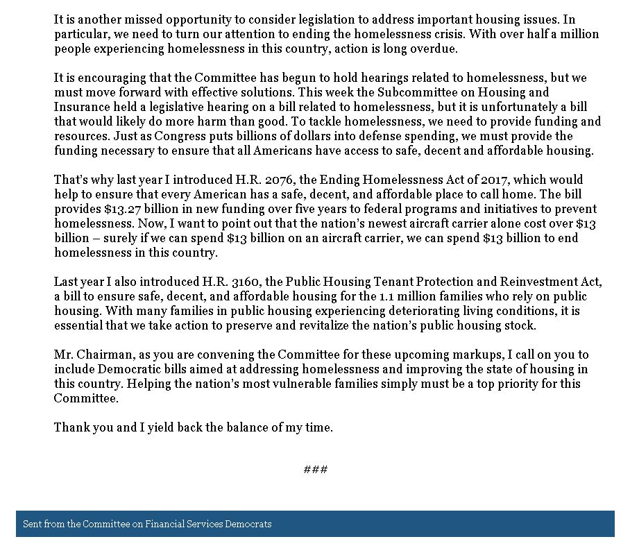 At Committee Markup, Ranking Member @RepMaxineWaters Calls on Chairman to Consider #Democratic Legislation and Prioritize the Nation’s Most Vulnerable Families