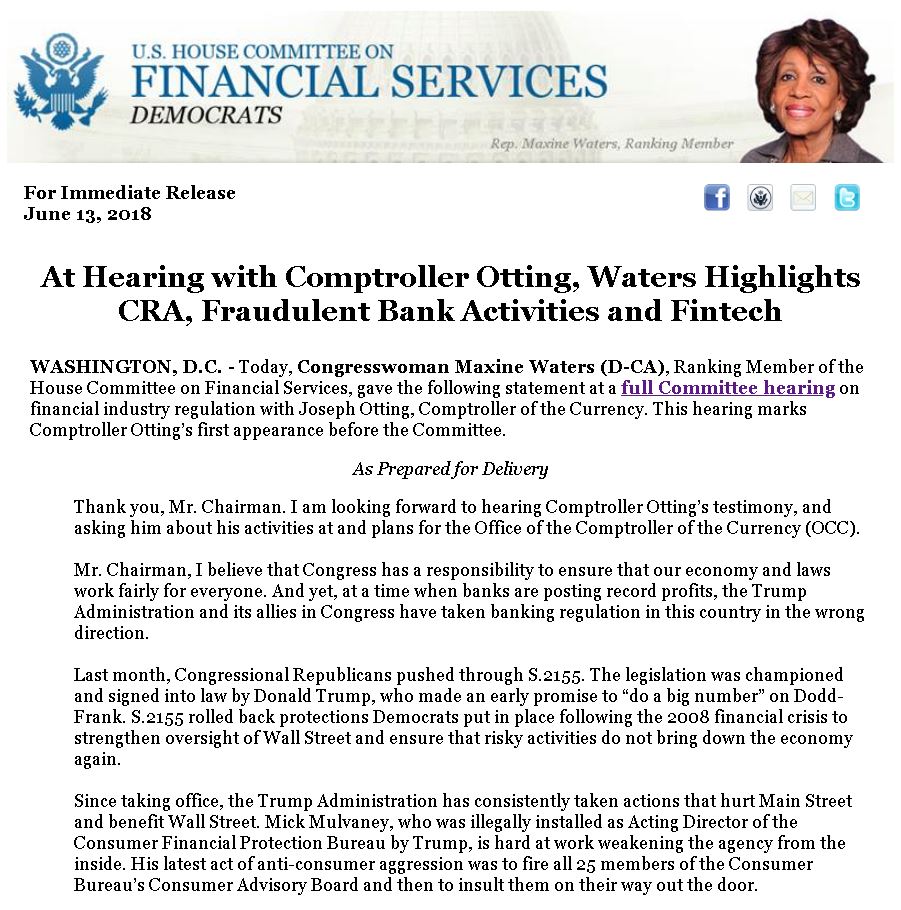 "The American public has the right to know if [Comptroller Otting] plans to follow in the deregulatory, anti-consumer footsteps of this administration."