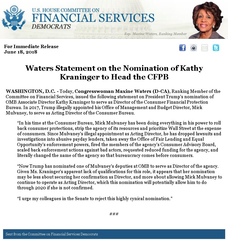 - Ranking Member @RepMaxineWaters on the Nomination of Kathy Kraninger to Head the @CFPB | https://go.usa.gov/xQuSk pic.twitter.com/uKhCDxLThx