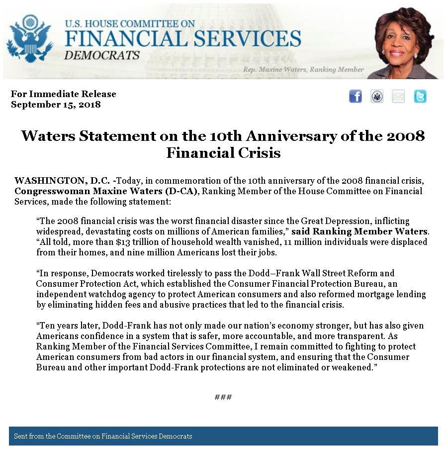 #RELEASE: Ranking Member @RepMaxineWaters' Statement on the 10th Anniversary of the 2008 Financial Crisis