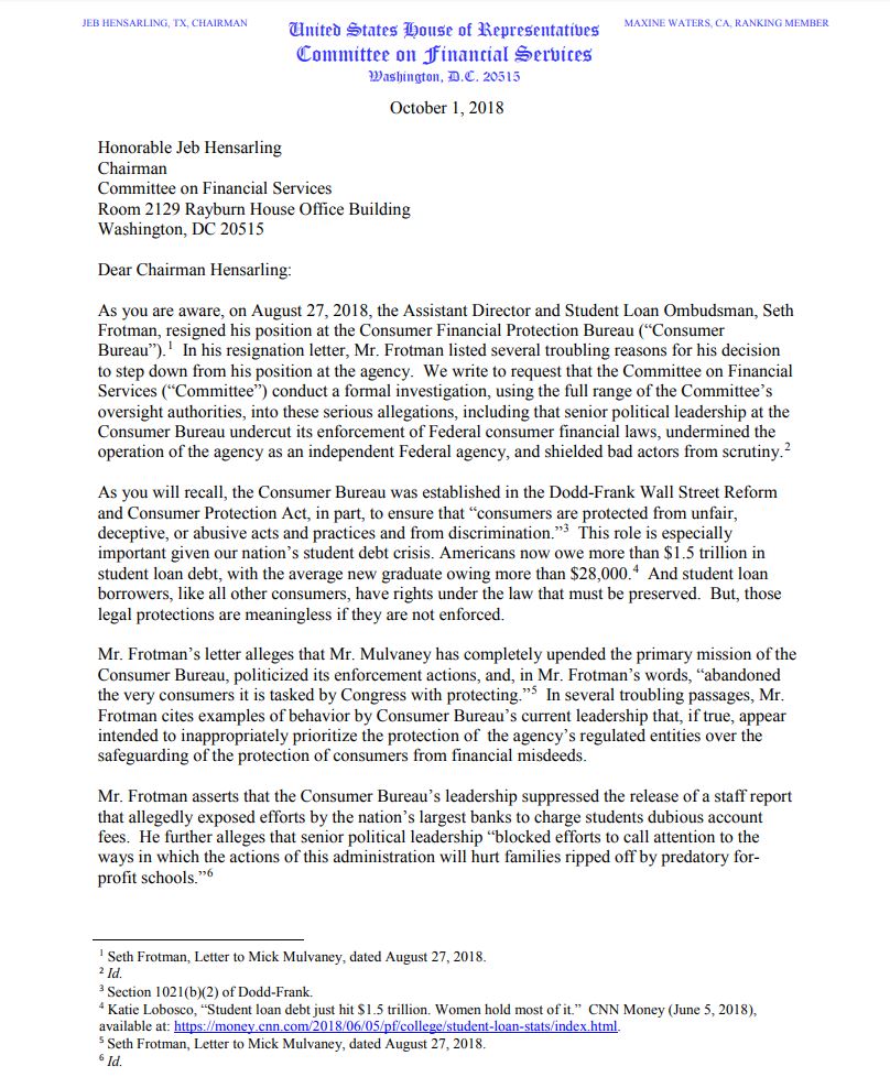 #RELEASE: Ranking Member @RepMaxineWaters Leads Call for Committee to Investigate Failures to Protect #Student Loan Borrowers at the @CFPB