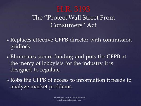 RT @FinanReformNow: #HR3193, The "Protect Wall Street From Consumers" Act #realbankreform #CFPB #consumerprotection pic.twitter.com/kMxRuaJomA"