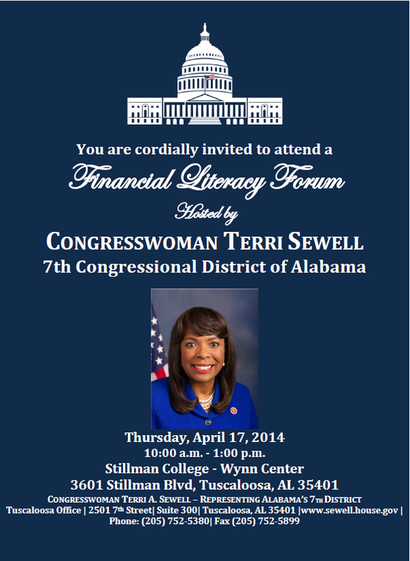 MT @RepTerriSewell: Join us for a Financial Literacy Forum at Stillman College on Thursday April 17th! pic.twitter.com/bvd2hgSTPk #FinLitMonth