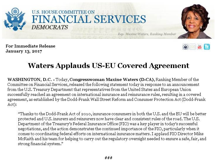 #RELEASE: Ranking Member @MaxineWaters Applauds US-EU Covered Agreement - http://go.usa.gov/x9Ejq pic.twitter.com/hcjHJDnViN