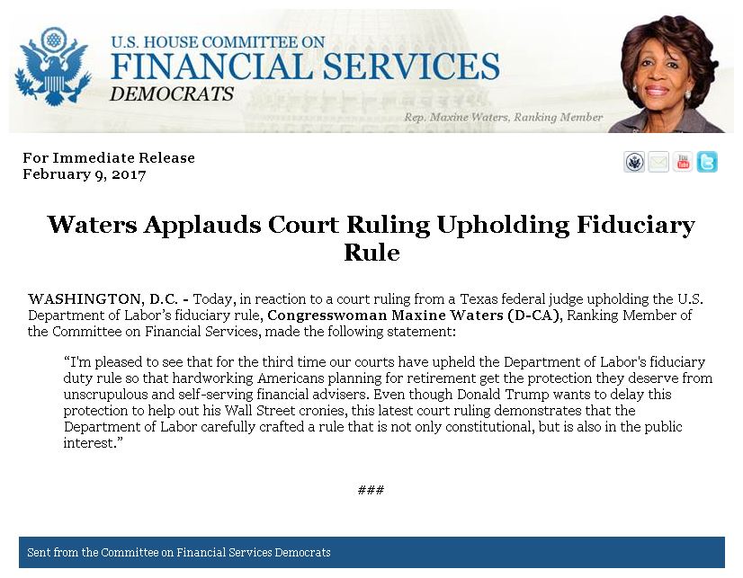 #RELEASE: @MaxineWaters Applauds Court Ruling Upholding #FiduciaryRule
