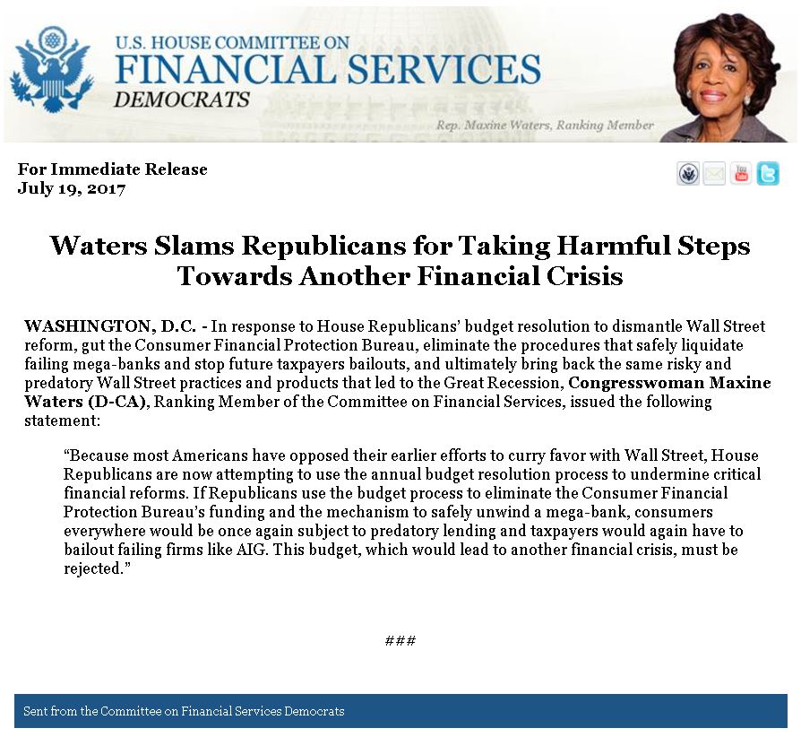 "@HouseGOP are now attempting to use the annual budget resolution process to undermine critical financial reforms.”