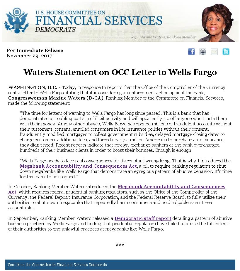 "The time for letters of warning to #WellsFargo has long since passed. This is a bank that has demonstrated a troubling pattern of illicit activity & will apparently rip off anyone who trusts them w/ their money...Enough is enough” - @RepMaxineWaters https://go.usa.gov/xn8en pic.twitter.com/qs4PoYOkPM