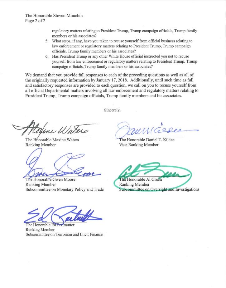 RMs @RepMaxineWaters @RepDanKildee @RepGwenMoore @RepAlGreen @RepPerlmutter to #Mnuchin: