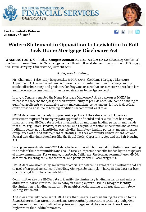 "History has repeatedly shown us that when financial institutions are merely trusted to operate in good faith, American consumers are left vulnerable to discriminatory and predatory lending, communities are stripped of wealth, and our economy is weakened."