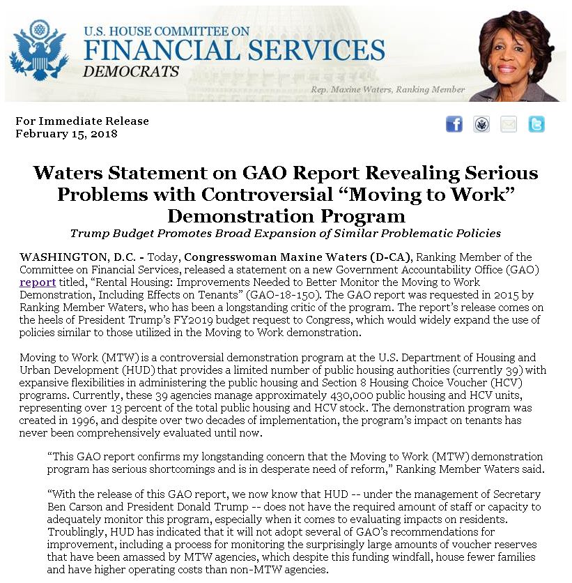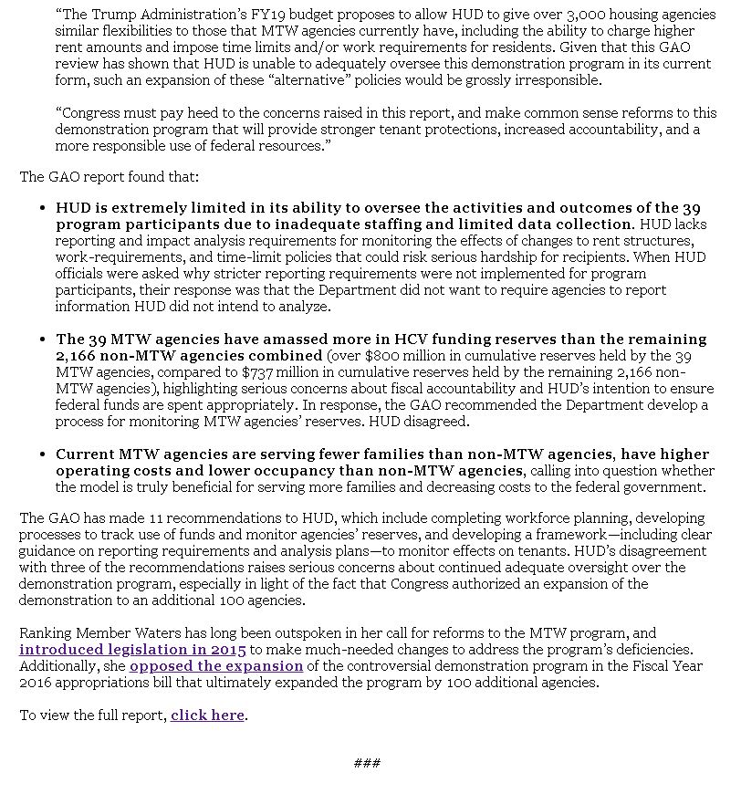 “This @USGAO report confirms my longstanding concern that the Moving to Work (MTW) demonstration program has serious shortcomings & is in desperate need of reform” - Ranking Member @RepMaxineWaters https://go.usa.gov/xnF3H pic.twitter.com/6DCboBia9a