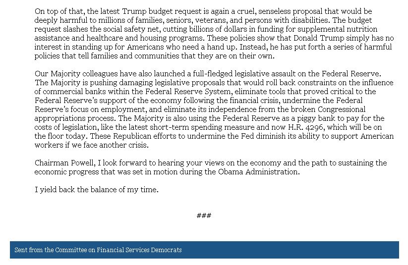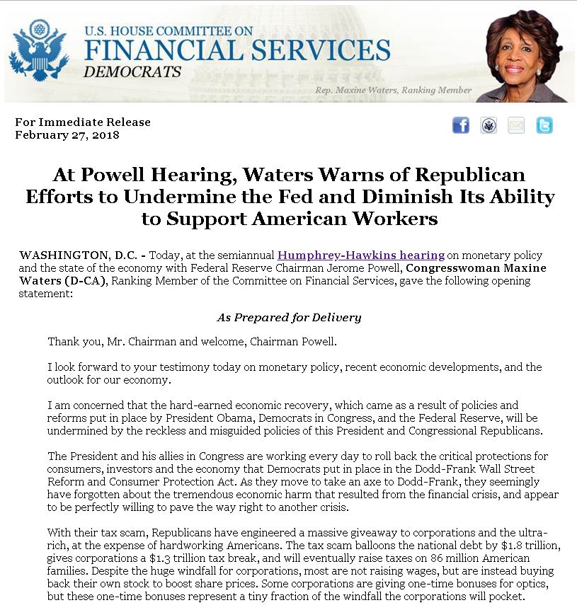 "I am concerned that the hard-earned econ. recovery, which came as a result of policies & reforms put in place by Pres. Obama, Dems in Congress, & the Fed, will be undermined by the reckless & misguided policies of this President & Congressional Republicans."
