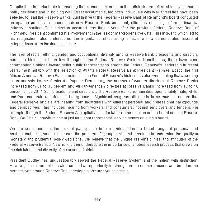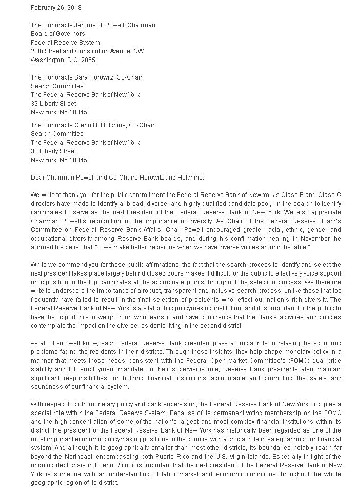 #ICYMI: RM @RepMaxineWaters & 25 @HouseDemocrats sent a letter to the @FederalReserve Chairman and Co-Chairs of the @NewYorkFed’s Search Committee, calling for a transparent and inclusive search process to identify candidates to serve as the next President of the @NewYorKFed.pic.twitter.com/WDmZrQOQ7R