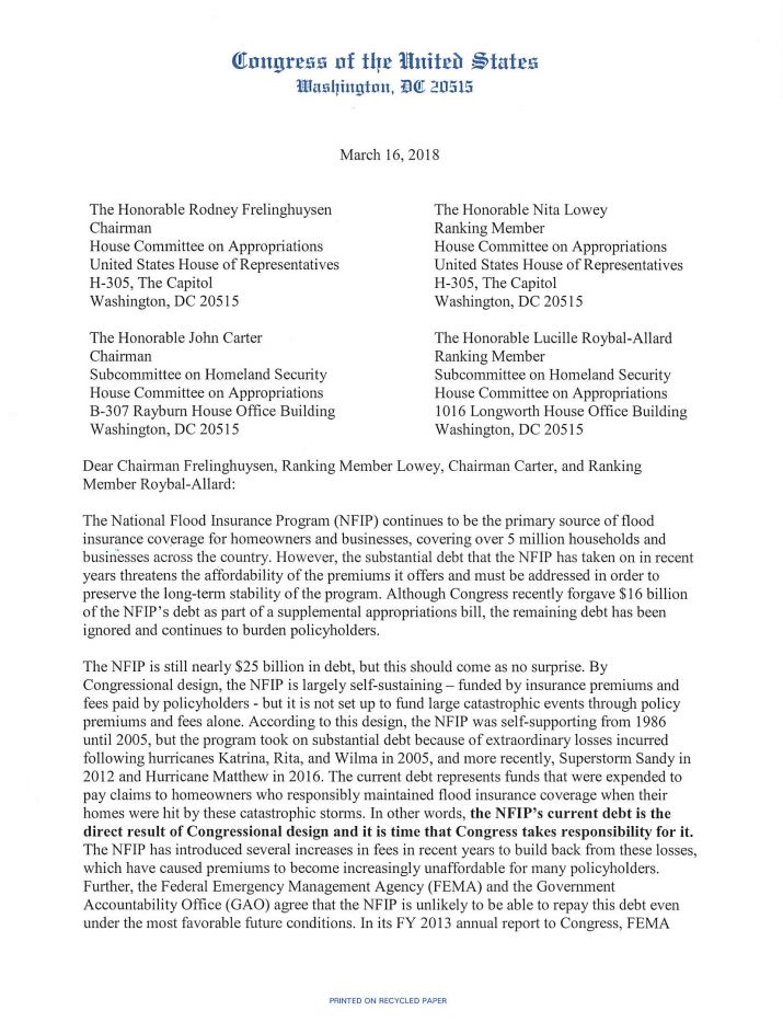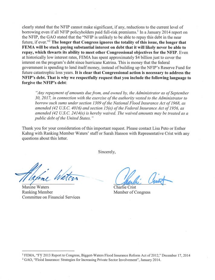 RM @RepMaxineWaters & @RepCharlieCrist to Congressional Appropriators: “…#NFIP’s current debt is the direct result of Congressional design and it is time that #Congress takes responsibility for it.”