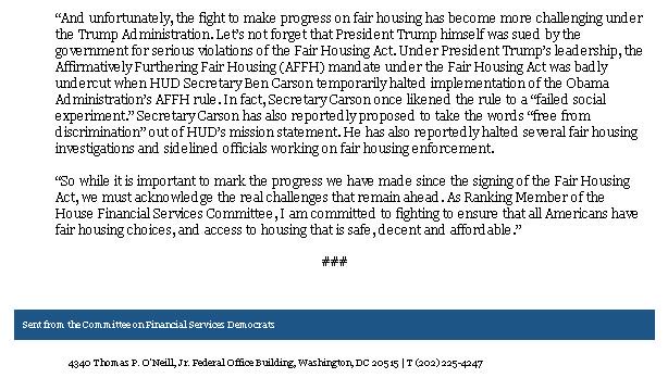 As Ranking Member of @FSCDems, I am committed to fighting to ensure that all Americans have fair housing choices, and access to housing that is safe, decent and affordable.” -RM @RepMaxineWaters #FairHousingAct #FairHousingis50pic.twitter.com/KOSIQPsNrC