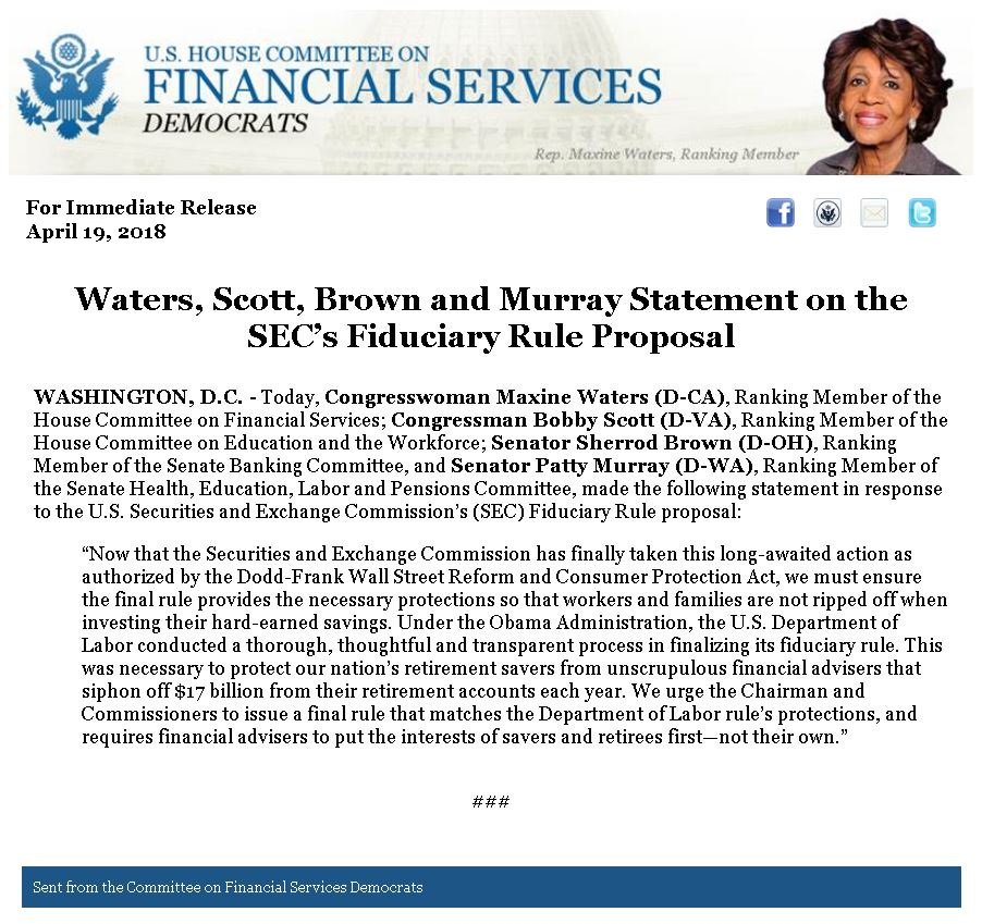 "We urge the [SEC] Chairman & Commissioners to issue a final [fiduciary] rule that matches the @USDOL rule’s protections, & requires financial advisers to put the interests of savers & retirees first—not their own." - @RepMaxineWaters, @BobbyScott, @SenSherrodBrown & @PattyMurraypic.twitter.com/V1NY0ICKN8