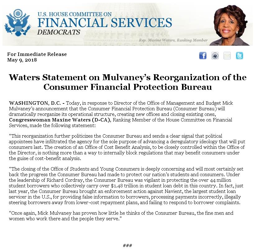 “The closing of the Office of Students and Young Consumers is deeply concerning and will most certainly set back the progress the @CFPB had made to protect our nation’s #students and consumers.” - Ranking Member @RepMaxineWaters | https://go.usa.gov/xQRn9 pic.twitter.com/37Jt6opdZo