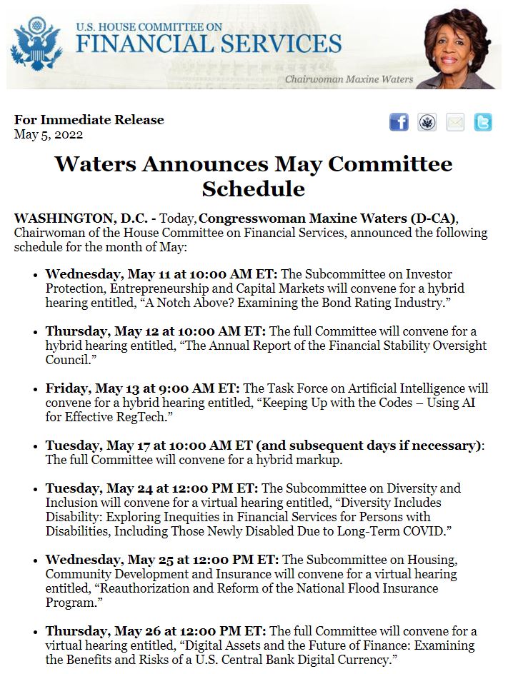 Chairwoman @RepMaxineWaters Announces#May Committee Schedule | https://go.usa.gov/xudVK pic.twitter.com/shLF7PDAMx