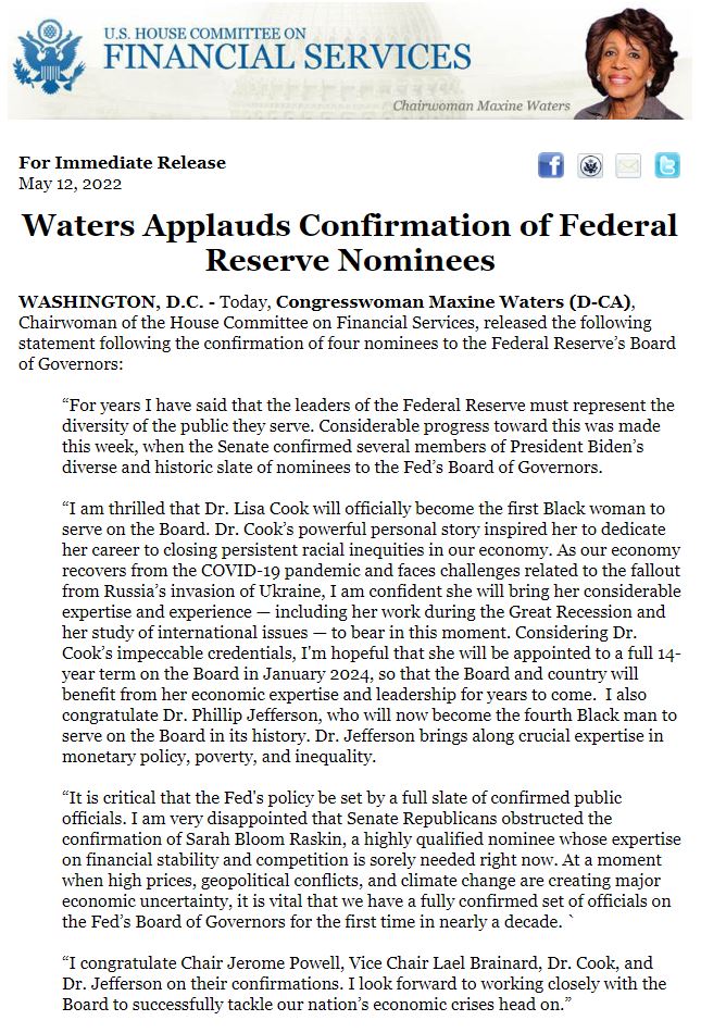 #RELEASE: Chairwoman@RepMaxineWaters Applauds Confirmation of@federalreserve Nominees | https://go.usa.gov/xuHNJ pic.twitter.com/YcriyXIzai