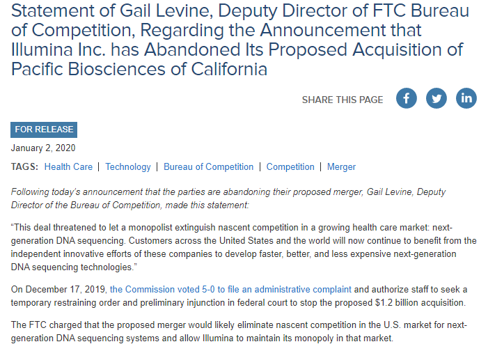 Statement of Gail Levine, Deputy Director of FTC Bureau of Competition, regarding the announcement that Illumina Inc. has abandoned its proposed acquisition of Pacific Biosciences of California: https://go.usa.gov/xpeNH