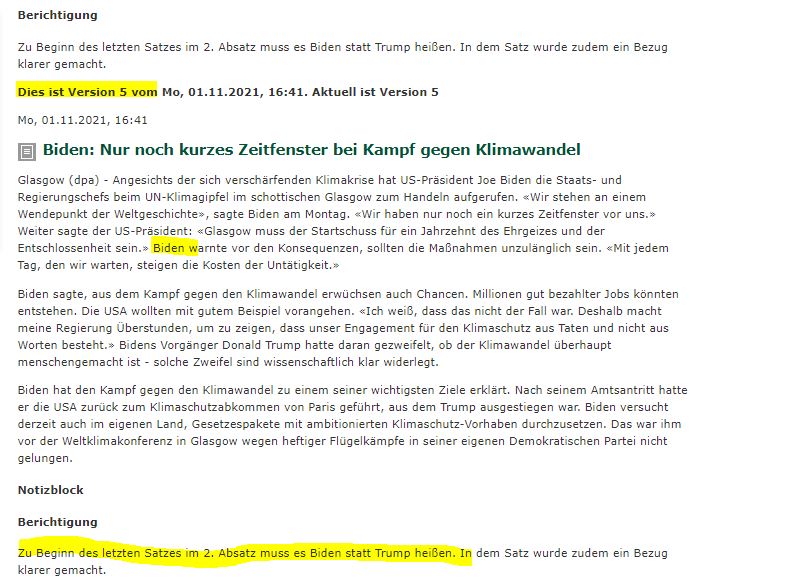 #Biden hat heute mit Müdigkeit zu kämpfen. Die@dpa-Meldung heute zu@POTUS-Auftritt in Rom#COP26 musste 5 (!) mal korrigiert werden. U.a. wurde Joe mit#Trump verwechselt: "Korrektur: Zu Beginn des letzten Satzes im 2. Absatz muss es Biden statt Trump heißen."