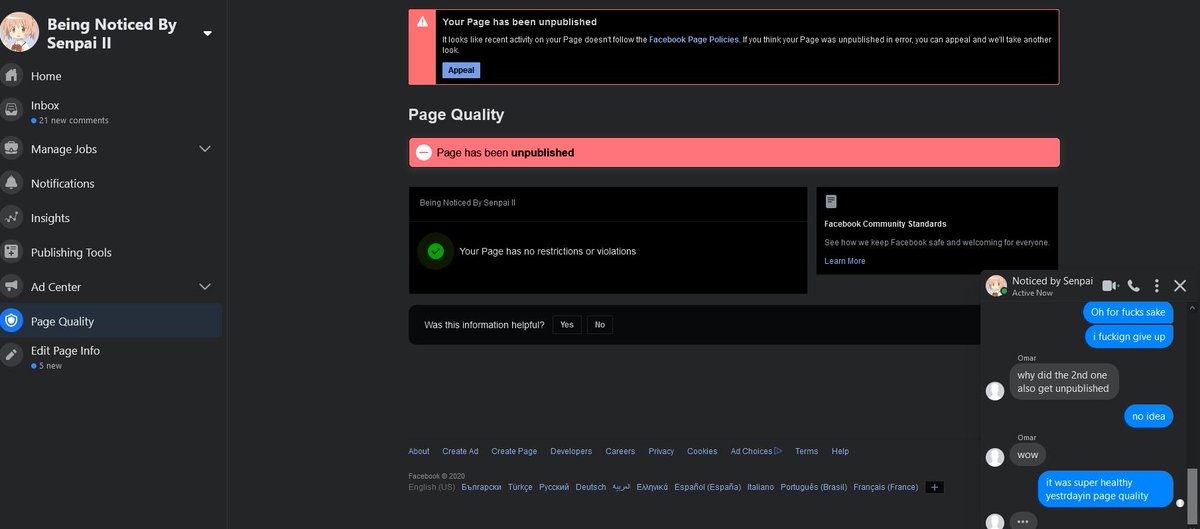 No warning and now you unpublished my second page which is in perfect condition, it never had posts taken down!What is going on, your system is bugging and it is not only my page, I appealed got answered and shut down by a bot !not a human Fix my pages they follow you rules !pic.twitter.com/VaeGUI76WJ