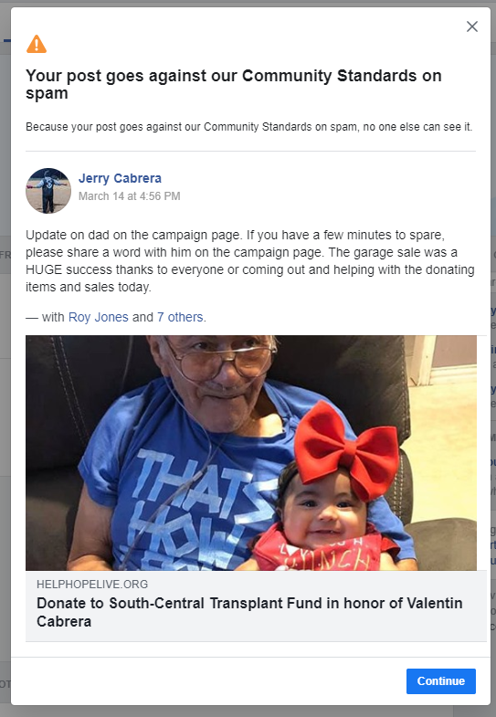 My dad recently had lung surgery and thanks to social media we were able to raise $4000 and now @Facebook @facebookapp is telling him that his @helphopeliveorg campaign is spam.... GET WITH IT!!!pic.twitter.com/Ns9BJ6rKhE