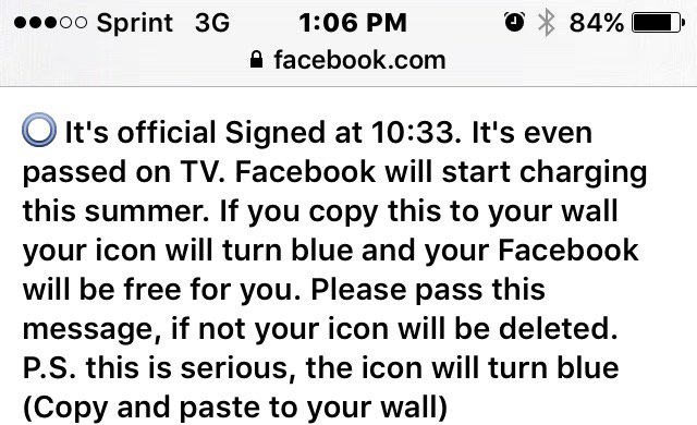 @facebook my friend posted a chain message she had signed saying your site is no longer free to use. True or false?pic.twitter.com/1UVcRWNUoJ