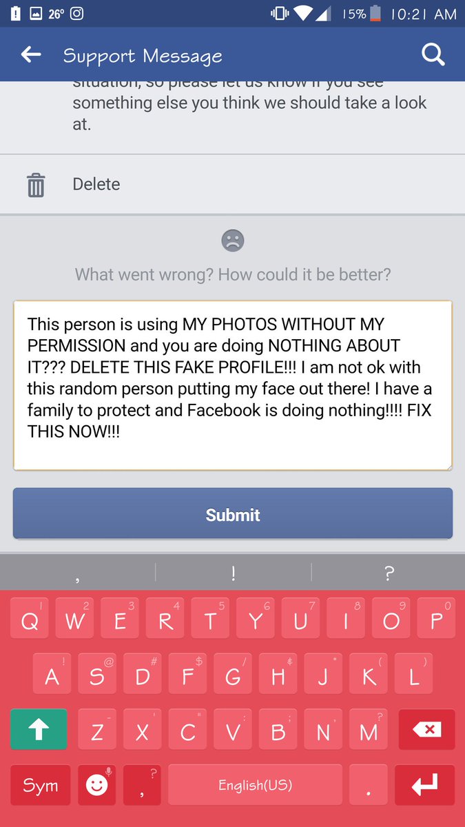 @facebook AT LEAST 20 PEOPLE HAVE REPORTED THIS AND YOU'RE GOING TO DO NOTHING?! I DID NOT GIVE THIS PERSON THE OK TO USE MY FACE! #catfishpic.twitter.com/Pucy16jz2P