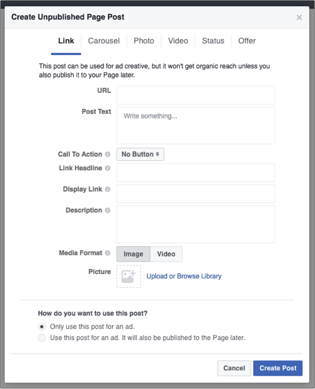 I used to have more options when creating a post in Power Editor (see image). Trying to find a way to create posts this way again.pic.twitter.com/W5X9jrLpMX