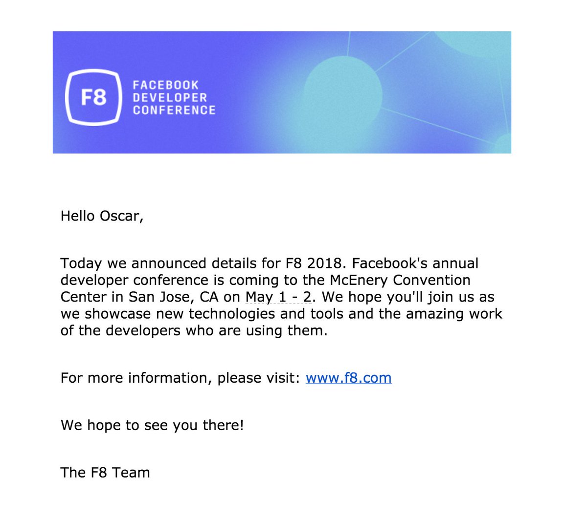 Just got my email reminder for the annual @Facebook's Developer Conference @ McEnery Convention Center in San Jose, CA #F8 #CantWaitpic.twitter.com/rJiT4LDMiI