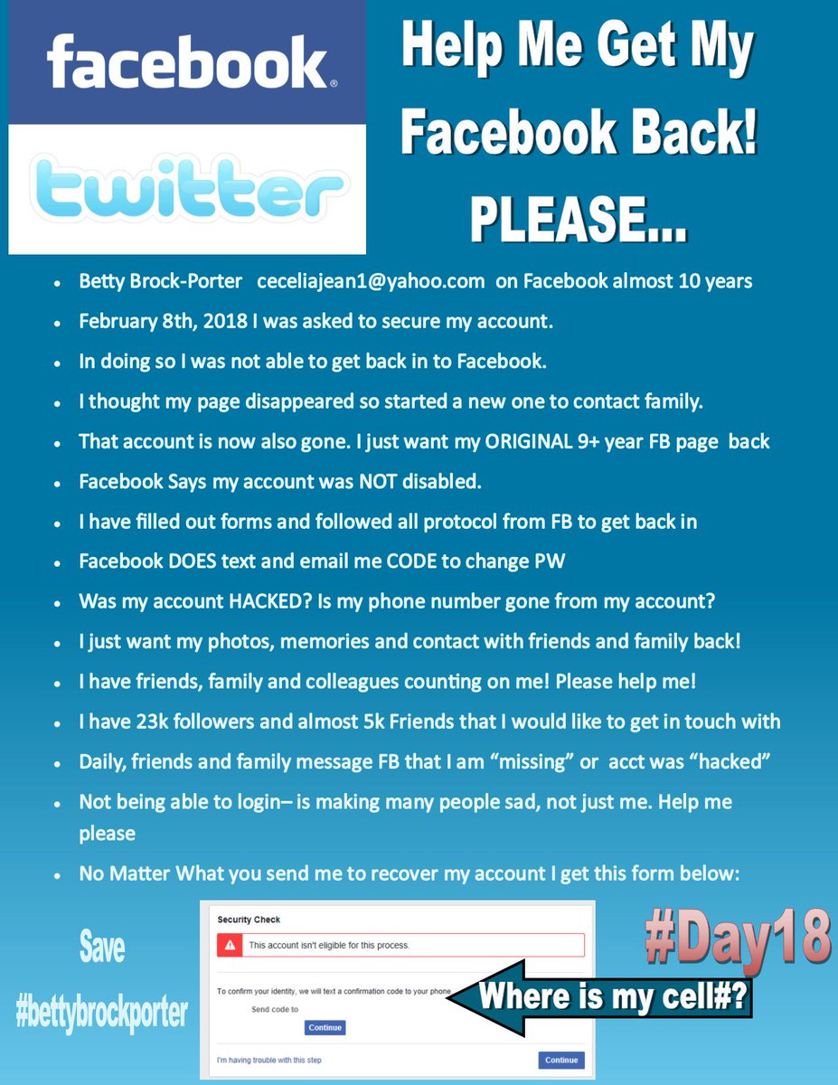 please help me #Facebook as @doyouhaveaface Betty Brock-Porter after 10 years is down and I NEED HELP getting back into my account. 10 years of photos and memories gone - devastated. 10 days and says my account is ineligible. I just want to get back into my account #ineligible ?