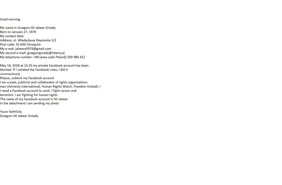 May 14, 2018 at 14.35 my private Facebook account has been blocked. If I violated the Facebook rules, I did it unconsciously Please, unblock my Facebook account I am a poet, publicist and collaborator of rights organizations man I need a Facebook account to work.pic.twitter.com/tecMe0dDLQ
