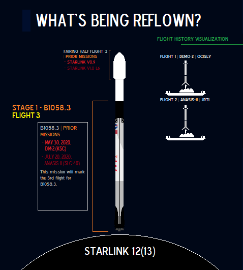 UPDATED The booster supporting Starlink 12(13), B1058.3, previously supported the historic launch of the #SpaceX #Demo2 Mission, and the #ANASIS2 Mission. One fairing supporting this mission previously supported #Starlink V0.9 and Starlink v1.0 L6. #Falcon9pic.twitter.com/qlDHXEgghX