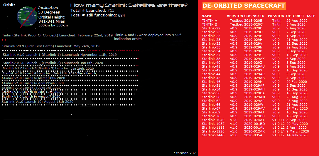 #SpaceX #Starlink By The Numbers: - Total # of Satellites launched: 715 - Total Still In Orbit: 684 - Total # De-Orbited: 31 #Falcon9pic.twitter.com/Q1EqtfVWWa